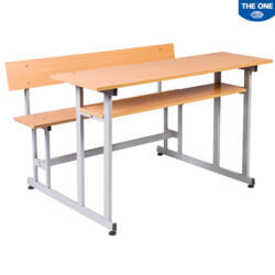 Kiểu dáng: Bộ bàn ghế 2 chỗ ngồi, bàn liền ghế, cạnh bàn có móc treo cặp. Chân bàn khung thép chắc chắn, mặt chữ nhật, yếm gỗ. Ghế khung thép mặt tựa gỗ.