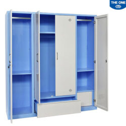 Kiểu dáng: Tủ sắt gia đình 3 khoang, 4 cánh mở, 1 ngăn kéo. 2 khoang ngoài cùng có 1 cánh mở, trong có 1 đợt di động & suốt treo áo, khoang phụ có khóa locker. Khoang giữa 2 cánh mở, trong có 1 đợt cố định, suốt treo áo.